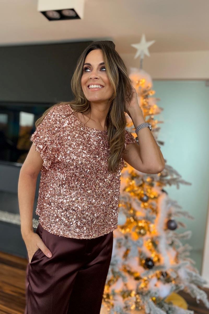 Vier de feestdagen in stijl met een adembenemende outfit. De top is een sprankelende creatie, bezaaid met glinsterende pailletten die in prachtig roze schitteren. De subtiele franjes aan de mouwen voegen een speelse toets toe en maken het geheel onweerstaanbaar elegant.