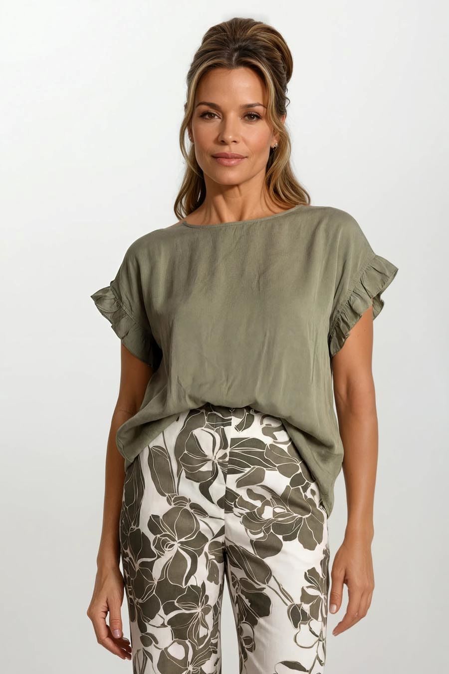 Mosgroene blouse met een vloeiende pasvorm die zorgt voor comfort en elegantie. De subtiele rushes aan de mouwen geven het een romantisch tintje en voegen structuur toe aan het ontwerp.