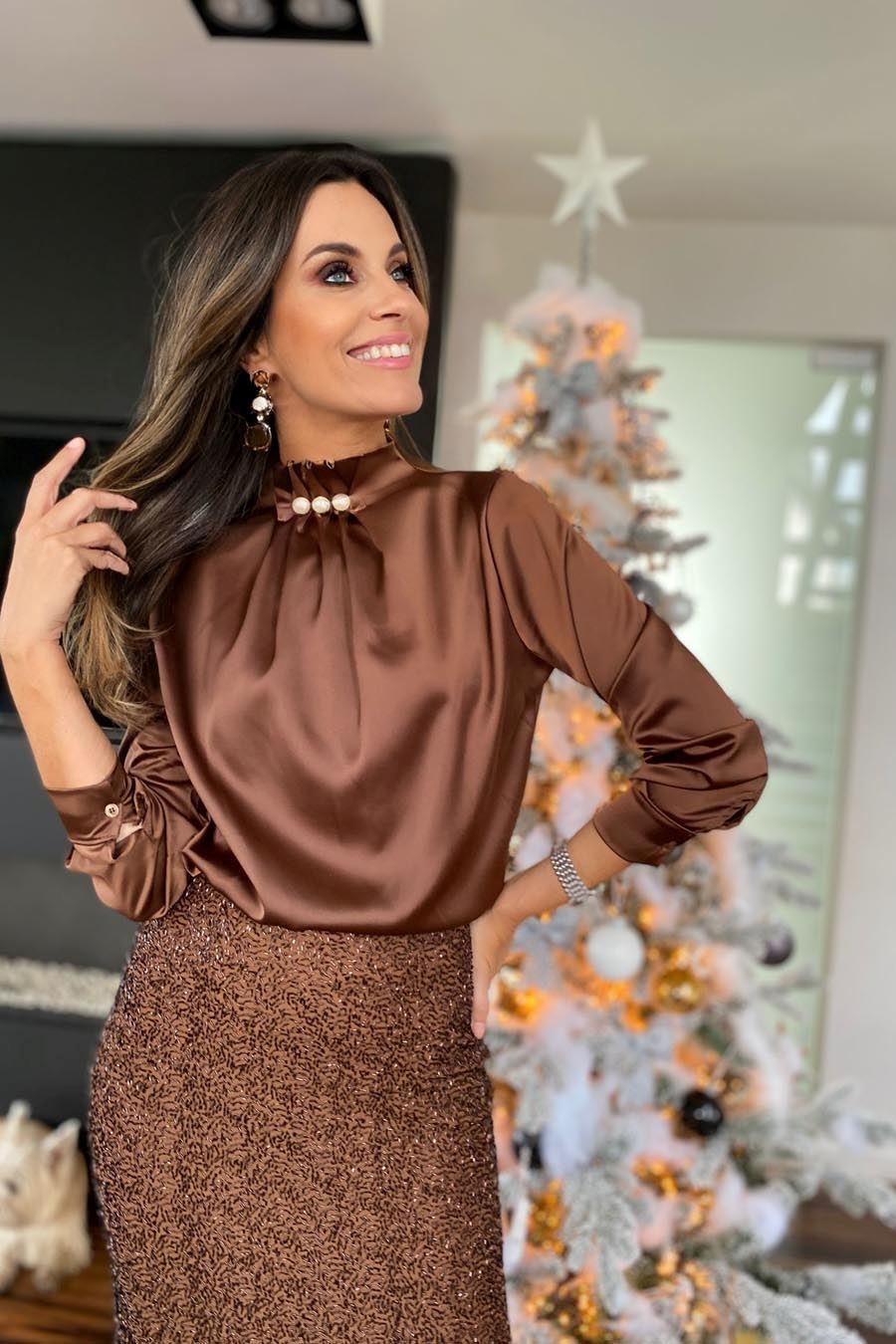 Deze look is een prachtige combinatie van elegantie en stijlvolle details. De satijnen top heeft een rijke, diepe bruine kleur en een verfijnde glans. De hoge halslijn is afgewerkt met subtiele plooien en mooie pareldetails, wat een vleugje luxe toevoegt. De lange mouwen zijn voorzien van knoopsluitingen die een klassieke toets geven aan het geheel.