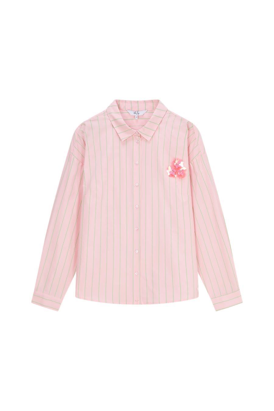 Deze roze blouse heeft subtiele groene strepen en vrolijke bloemenapplicatie. Perfect om je outfit wat kleur te geven!