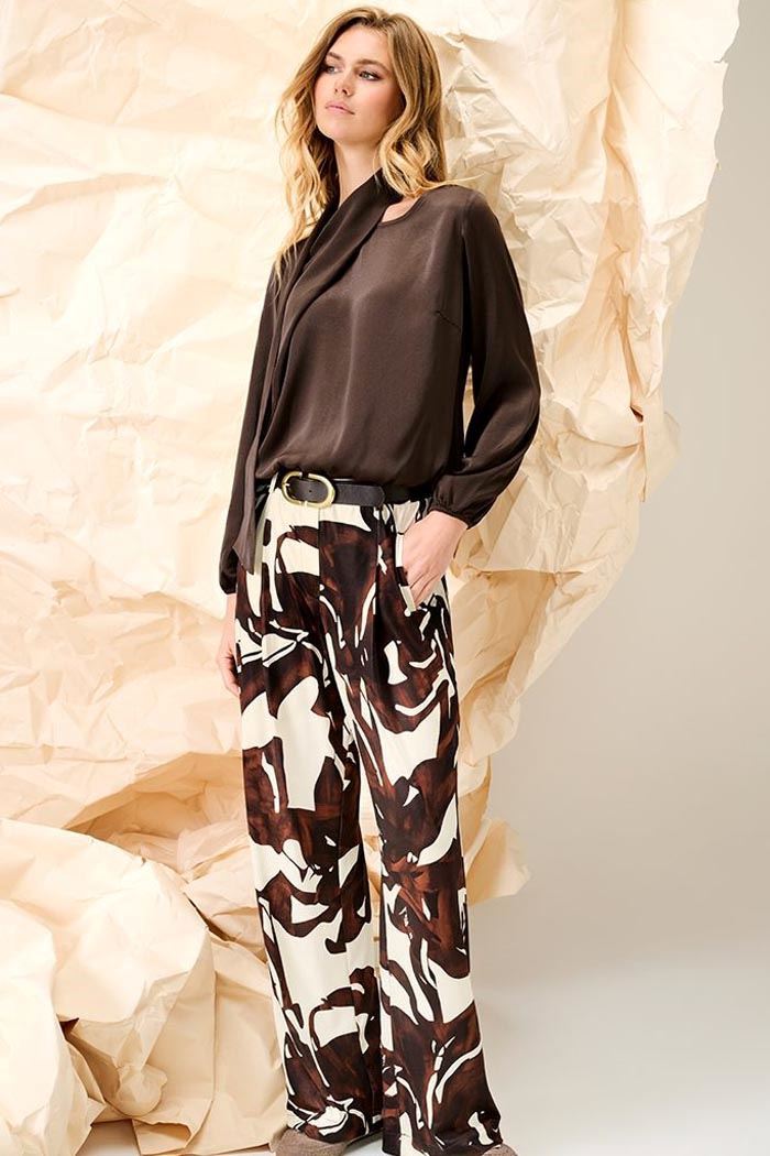 Wat een stijlvolle blouse! Deze chocoladebruine top heeft een elegante sjaalkraag en lange mouwen. Perfect voor zowel kantoor als een avondje uit!
