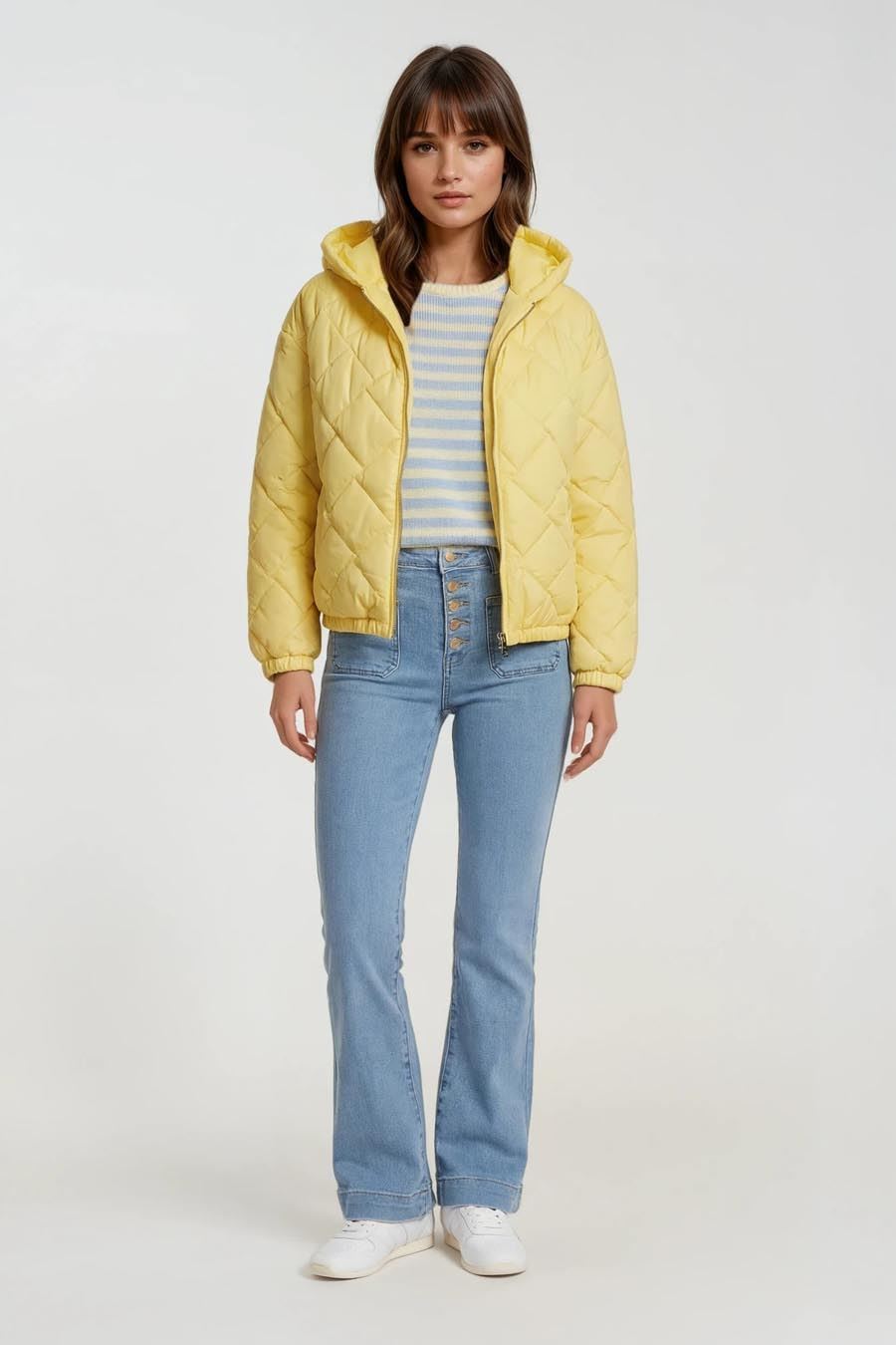De jas straalt met zijn levendige citroengele kleur, perfect om elke grauwe dag op te fleuren. Met een stijlvol pufferdesign biedt deze jas niet alleen warmte, maar ook een trendy uitstraling. De jas heeft een praktische ritssluiting die functioneel en stijlvol is, terwijl de gewatteerde vorm extra comfort en bescherming tegen de kou biedt. De capuchon voegt een extra laag bescherming toe voor winderige dagen.