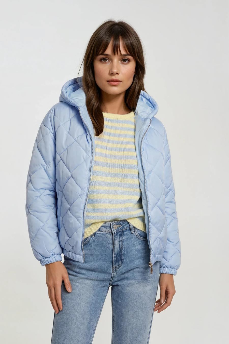 Deze outfit combineert een casual stijl met een vleugje frisheid. De lichtblauwe gewatteerde jas biedt zowel warmte als elegantie, perfect voor koelere dagen. De jas heeft een comfortabele capuchon en een ritssluiting, wat hem praktisch en stijlvol maakt.