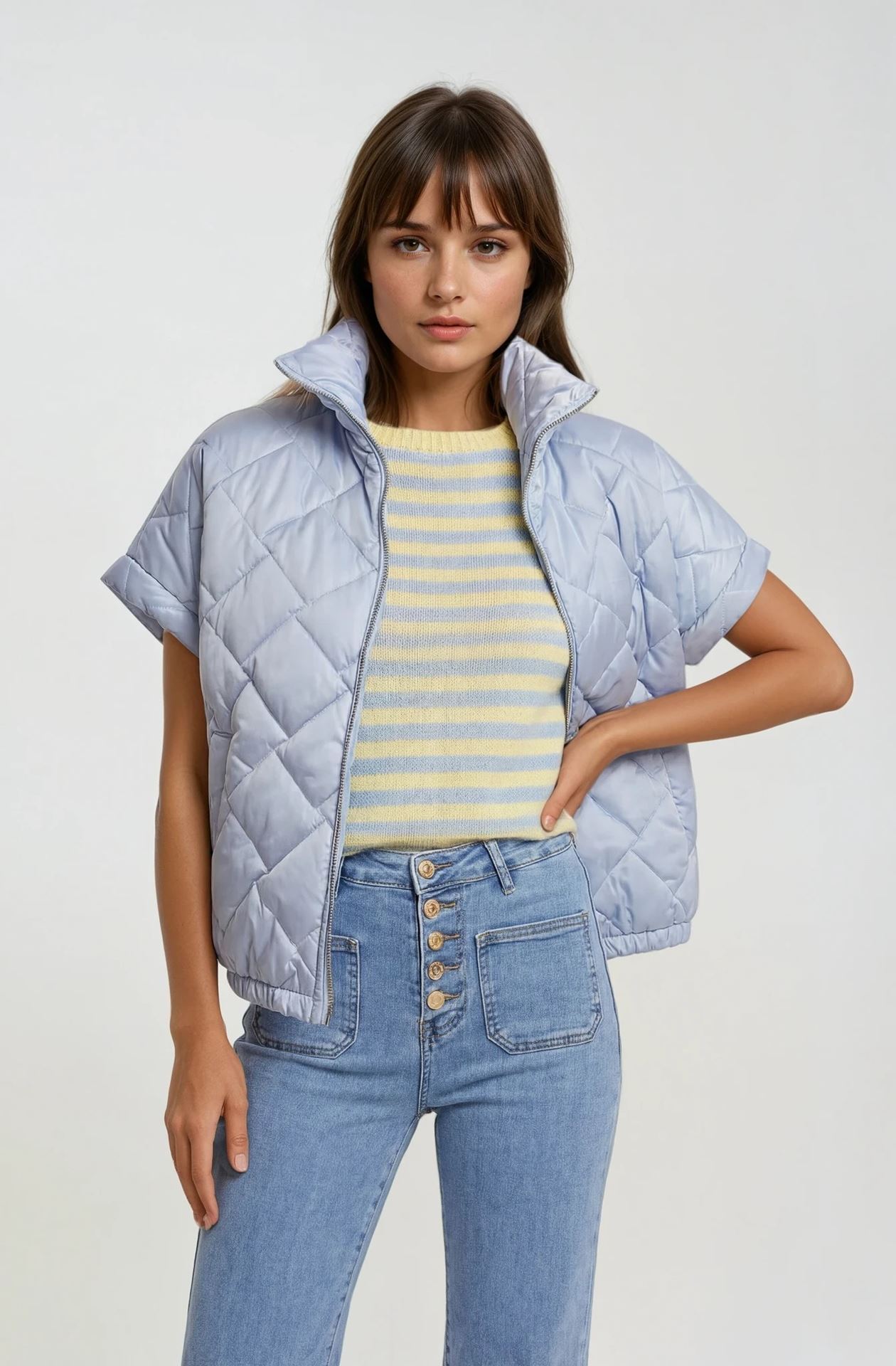 Op deze afbeelding straalt de outfit met een elegante en moderne uitstraling. De bovenkleding bestaat uit een lichtblauwe gewatteerde bodywarmer, perfect voor een frisse dag, met een stijlvolle diamantstructuur en korte mouwen die zorgen voor comfort en bewegingsvrijheid. Onder de bodywarmer wordt een frisse, zomerse gebreide trui gedragen met een speels streeppatroon in geel en lichtblauw, die een vleugje kleur en levendigheid toevoegt aan de look.
