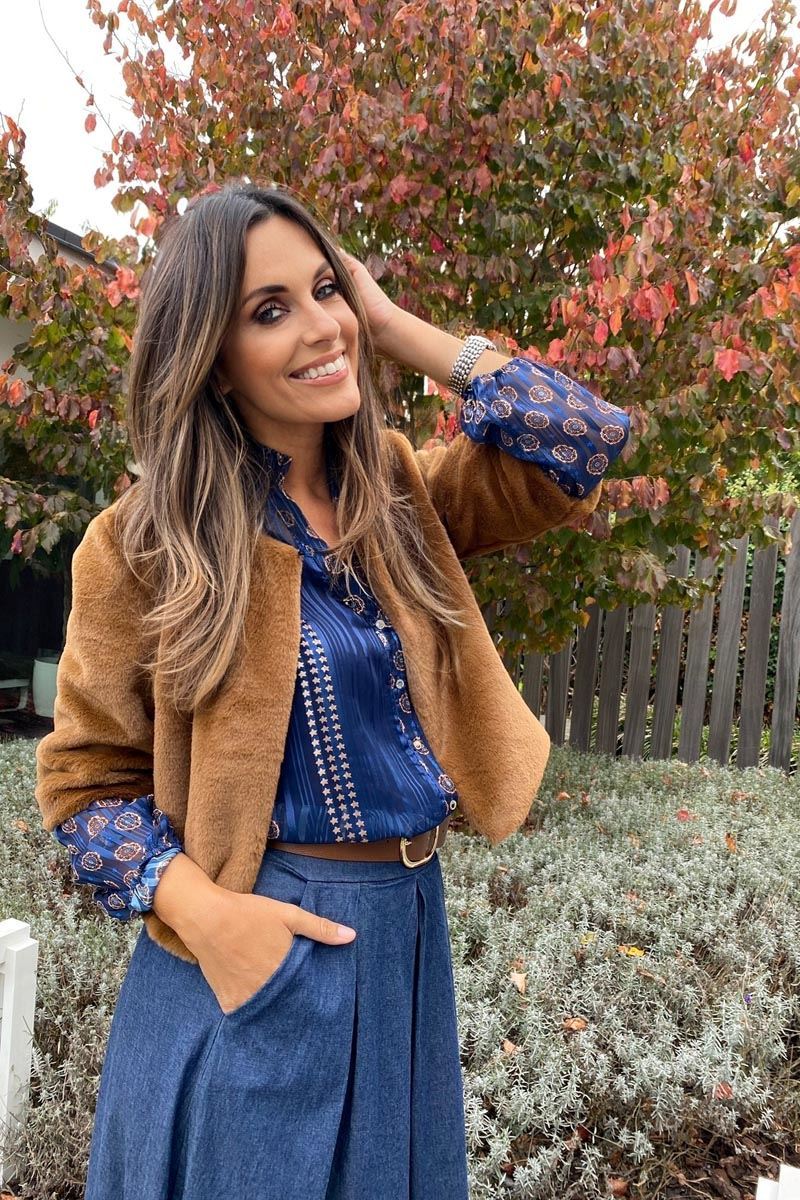 Geniet van een herfstachtige elegantie met deze prachtige kledingkeuze. De outfit begint met een luxueuze bruine jas, gemaakt van zacht materiaal dat warmte en stijl in gelijke mate biedt. Onder de jas is een blauwe blouse te zien met een opvallend patroon van sterren en geometrische vormen, wat een speelse touch toevoegt aan de chique uitstraling. De blouse heeft ook contrasterende mouwen met een elegant patroon, wat zorgt voor een subtiele doch opvallende combinatie.
