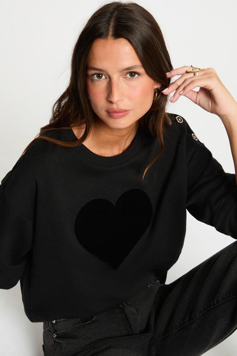 De model draagt een zwarte trui van Morgan met een groot hart voorop en stijlvolle knoopdetails op de schouder. Perfect voor elke dag!