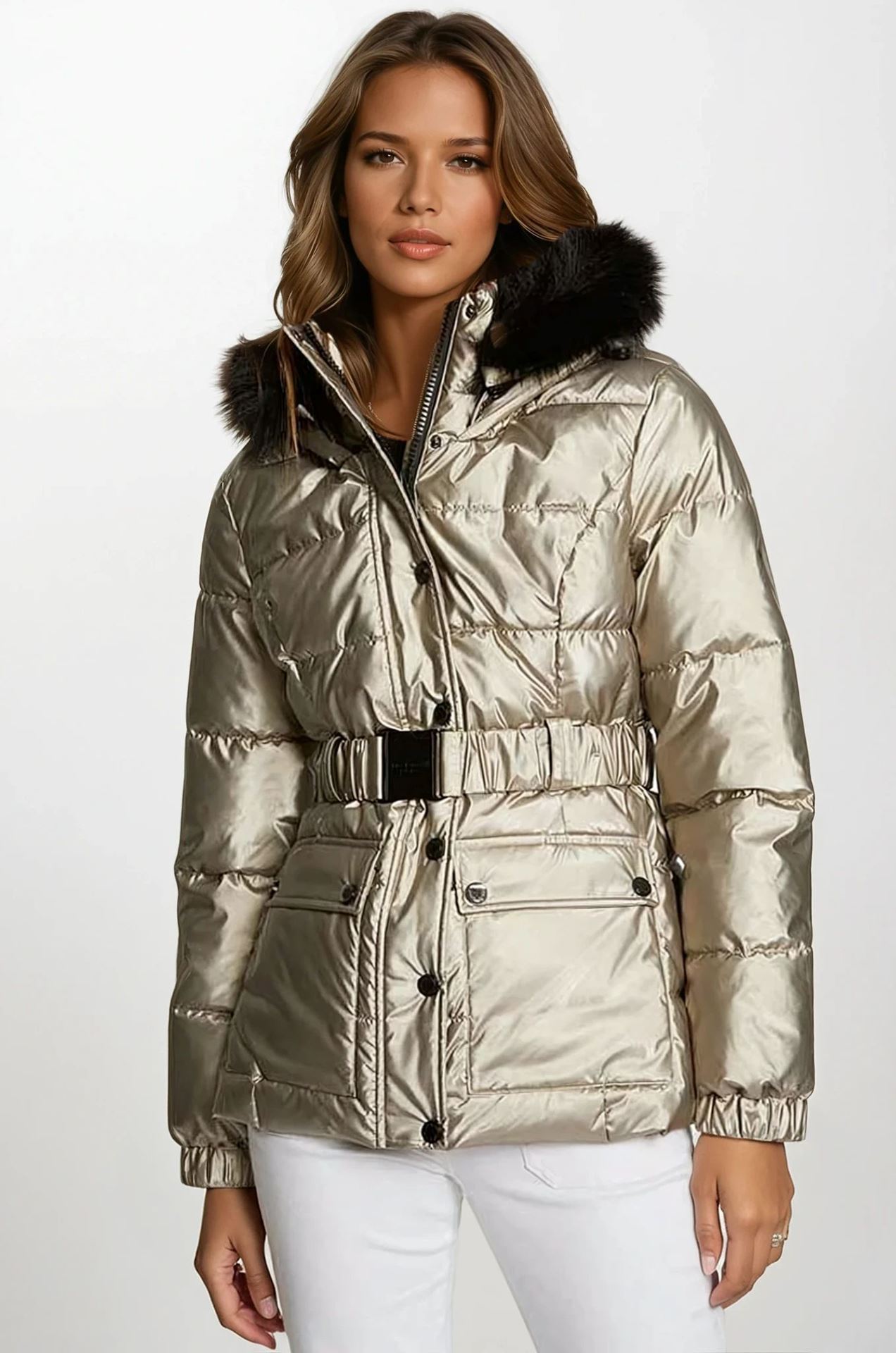 Deze warme, metallic zandkleurige gewatteerde jas met een zwarte nep bontkraag is perfect voor koude dagen. De riem geeft een stijlvolle touch.