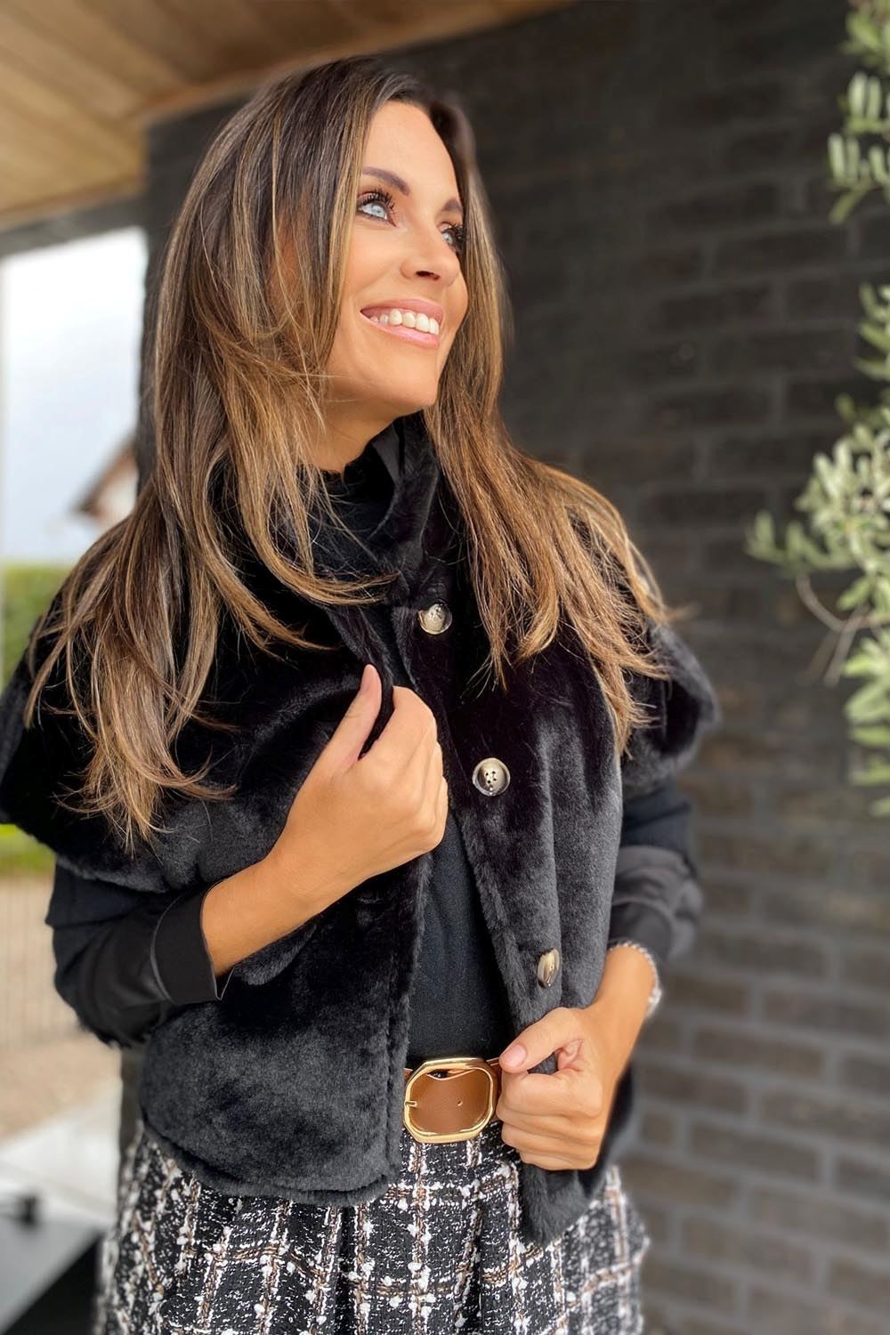 De outfit straalt luxe en stijl uit. De zwarte, fluwelen jas is knus en verfijnd, afgewerkt met glanzende knopen die een chique touch toevoegen. Onder de jas draagt ze een comfortabele zwarte trui, perfect voor een subtiele en elegante uitstraling.