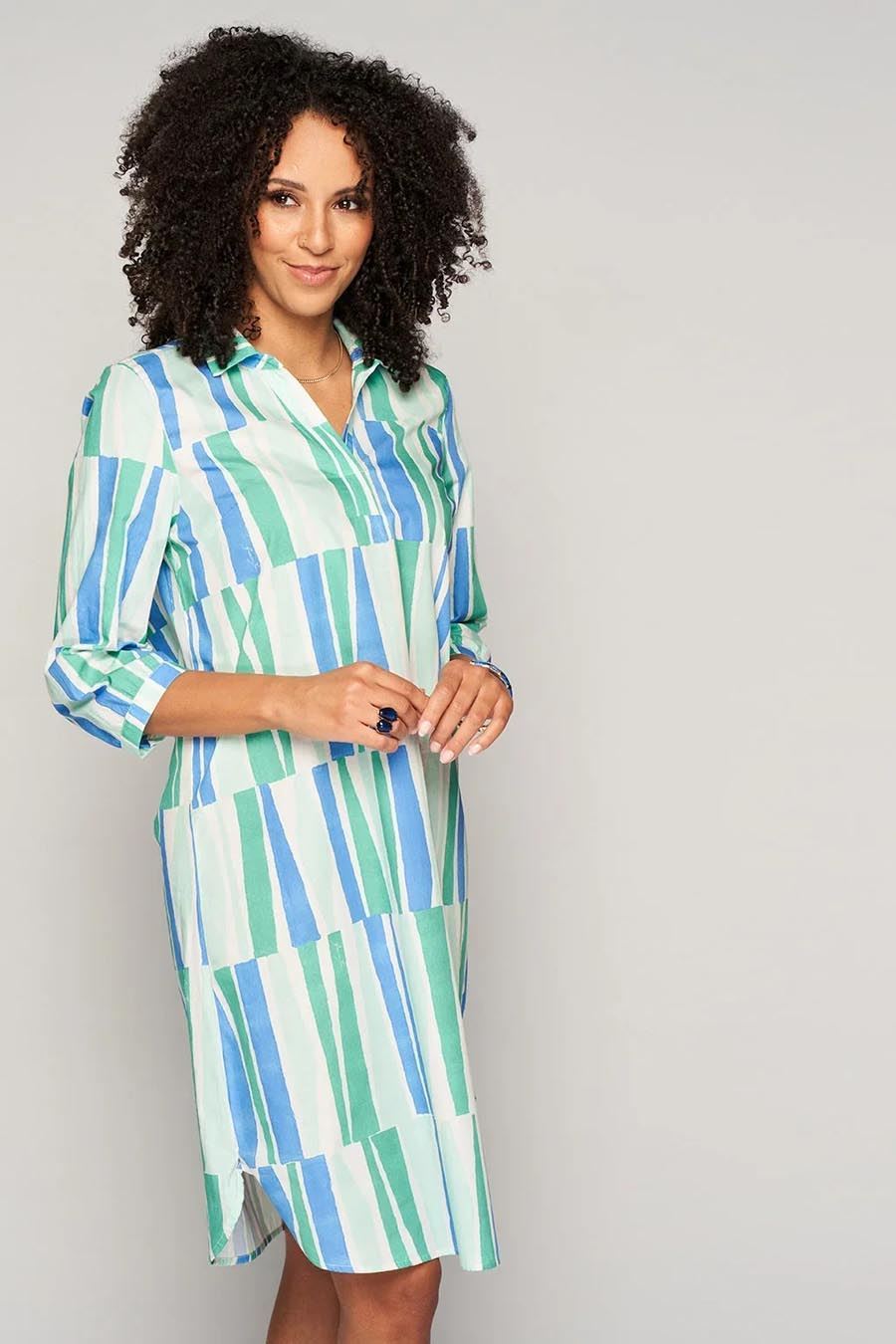 Groene en blauw-wit gestreepte tuniekjurk met rechte snit en kraag. Dit stijlvolle kledingstuk is perfect voor tal van gelegenheden.