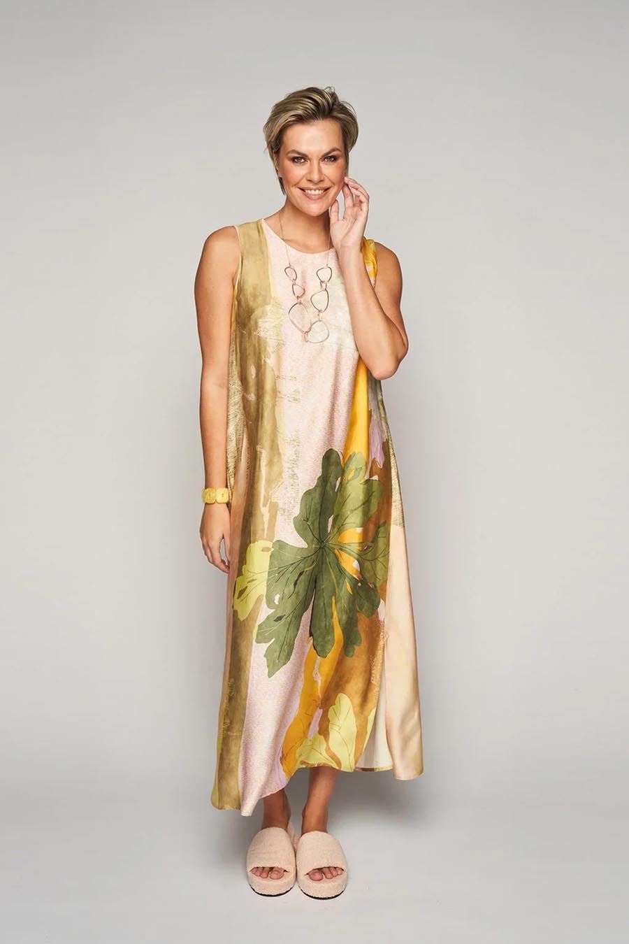 Deze prachtige mouwloze jurk van Green ice straalt elegantie en comfort uit. Het heeft een vloeiende, lange pasvorm en is gedecoreerd met een opvallend bladmotief in groentinten. Het design biedt een geweldig samenspel van warme geelbruine en zachte roze tinten, wat een unieke en artistieke uitstraling geeft.