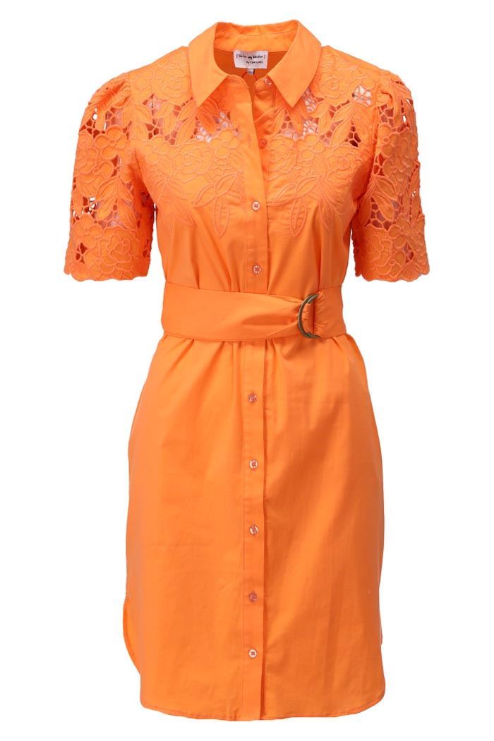 Deze schitterende oranje jurk van you are my lobster by k-design straalt elegantie en stijl uit. De jurk heeft een klassieke kraag en een doorlopende knoopsluiting aan de voorkant, wat het een elegante uitstraling geeft. De bloemenkant op de mouwen zorgt voor een romantische touch en maakt het ontwerp extra speciaal. Het bovenste deel van de jurk heeft delicate bloemenpatronen die prachtig samensmelten met het geheel. Rondom de taille zit een bijpassende riem die je figuur mooi benadrukt en een aansluitende pasvorm creëert. De combinatie van de levendige kleur en de verfijnde details maakt deze jurk perfect voor zowel zomerse dagen als speciale gelegenheden.