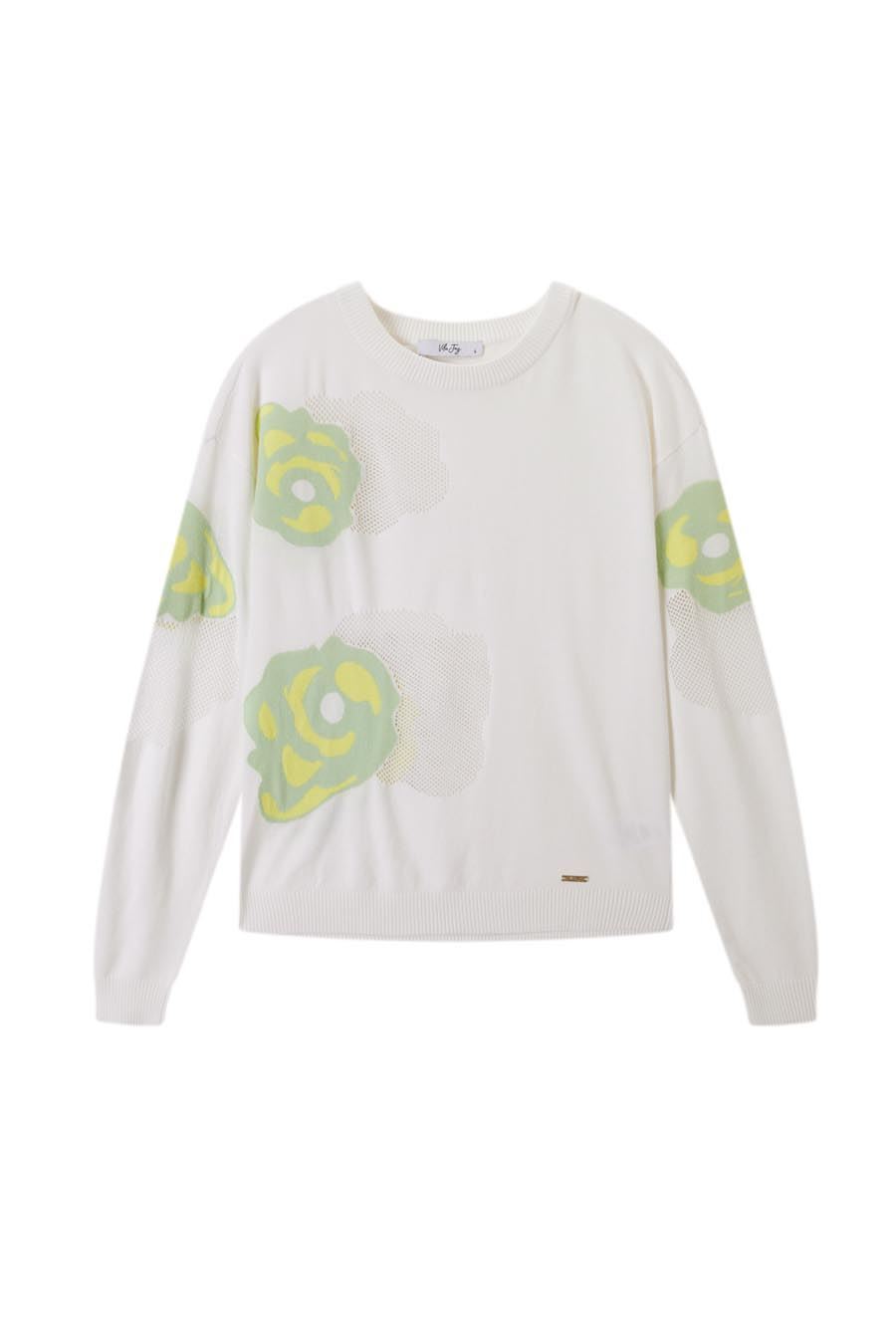 Deze trui van Vila Joy heeft een coole bloemenprint in muntgroen en geel en een fijn gaatjesmotief. Super comfy.