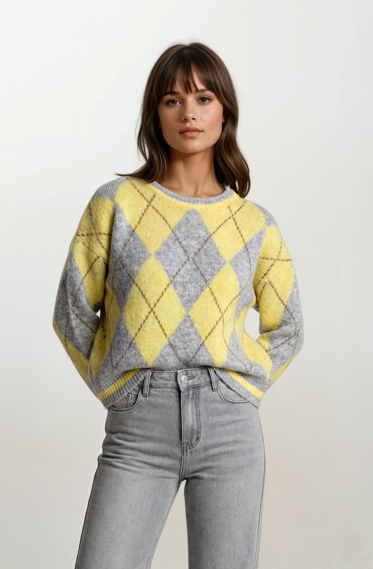 Deze sweater heeft een gezellige ruitpatroon in geel en grijs. Superzacht en perfect voor een casual dagje uit.