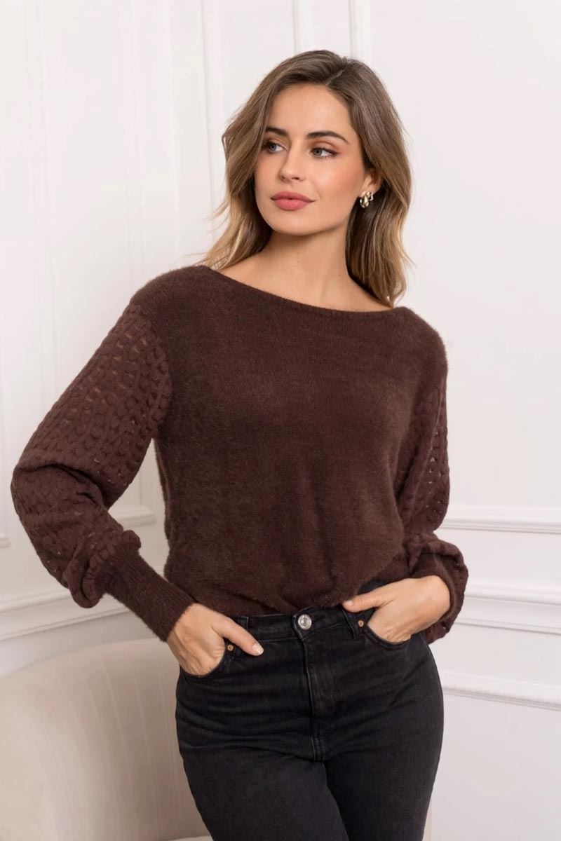 Chocolade bruine trui met kol en doorzichtige mouwen. De trui is TU en kan van maat 36 tot maat 42 gedragen worden.