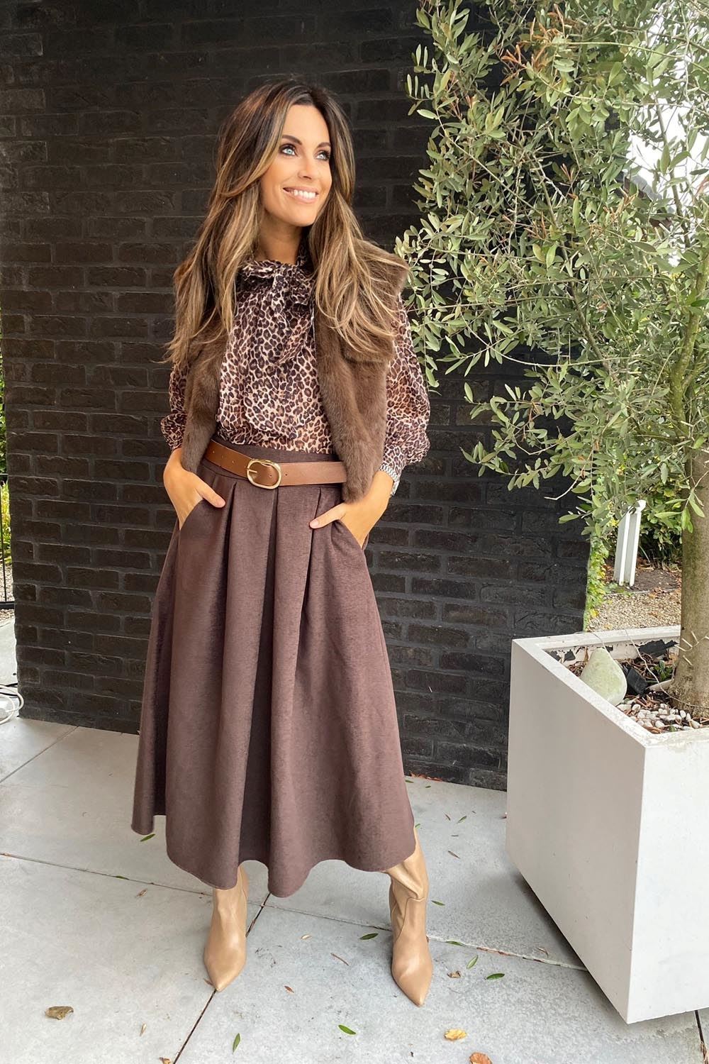 De outfit straalt elegantie uit met een prachtig bruine rok die soepel valt en een flatterende pasvorm heeft. Het materiaal lijkt zacht en comfortabel, perfect voor zowel casual als formele gelegenheden. De rok wordt stijlvol gecombineerd met een luipaardprint blouse die een speelse en moderne touch geeft. De blouse heeft een chique uitstraling en vormt een perfecte balans met de rok.