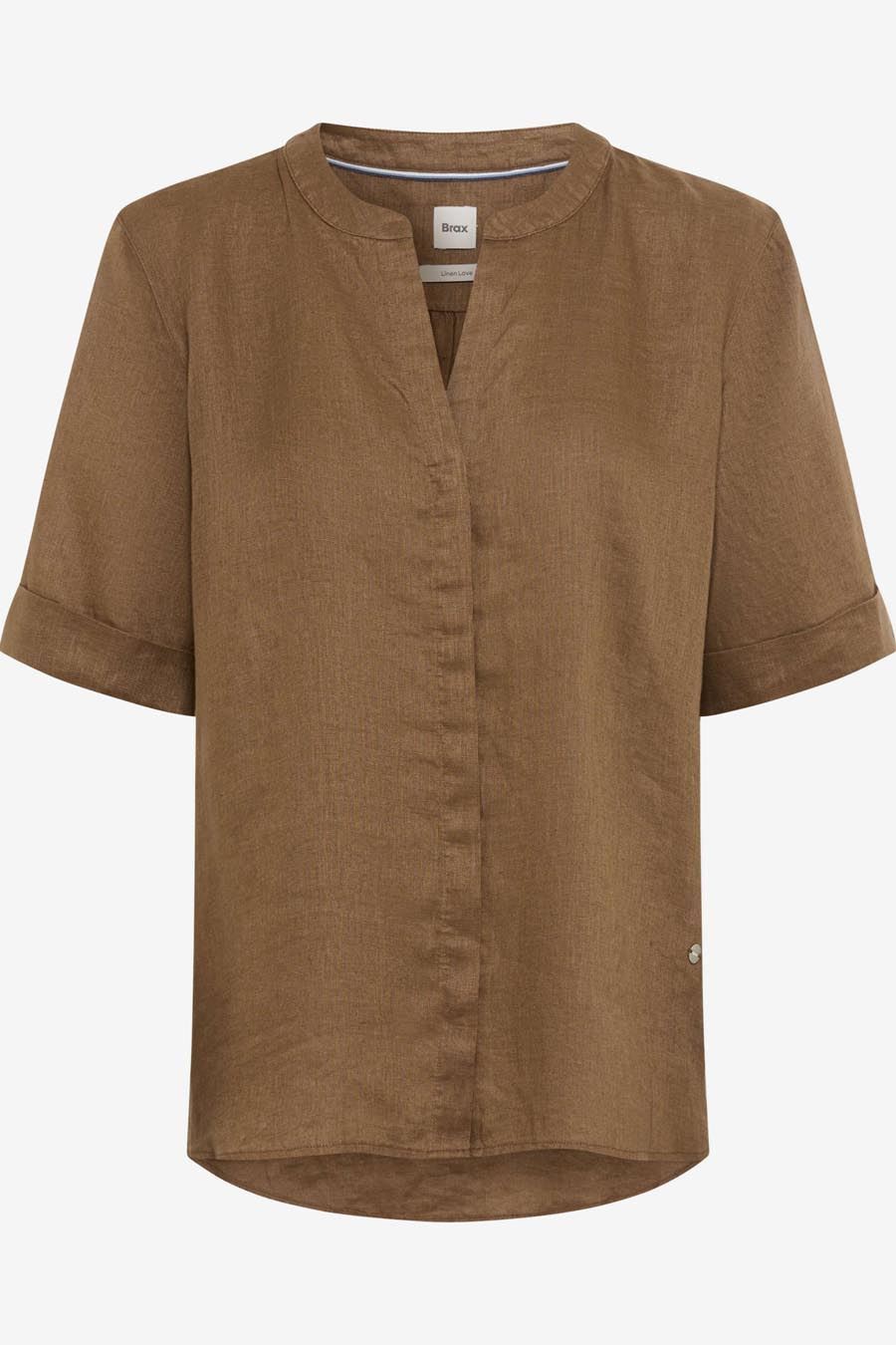 Deze stijlvolle blouse van Brax straalt een tijdloze elegantie uit. Gemaakt van een luchtige linnenmix, biedt deze blouse niet alleen comfort maar ook een verfijnde uitstraling. De warme bruine kleur is veelzijdig en makkelijk te combineren met verschillende looks. De blouse heeft een V-halslijn en verborgen knoopsluiting, waardoor ze een minimalistische en chique keuze is voor elke gelegenheid. De korte mouwen met opgerolde manchetten geven dit kledingstuk een casual doch geraffineerde touch. Perfect te dragen op een zomerse dag of onder een blazer voor een meer formele setting.