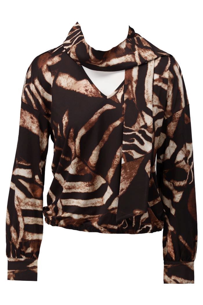 Deze top heeft een stoer, abstract patroon in bruin en zwart. Super leuk met de sjaalkraag details voor een speelse touch.