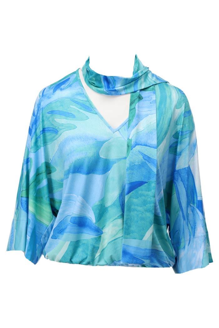 Deze prachtige blouse straalt in een levendig blauw-groen patroon dat doet denken aan aquarelkunst. Het ontwerp heeft een elegante V-hals die net genoeg blootgeeft voor een verfijnde uitstraling. De stof heeft een lichte glans, wat zorgt voor een extra vleugje luxe.