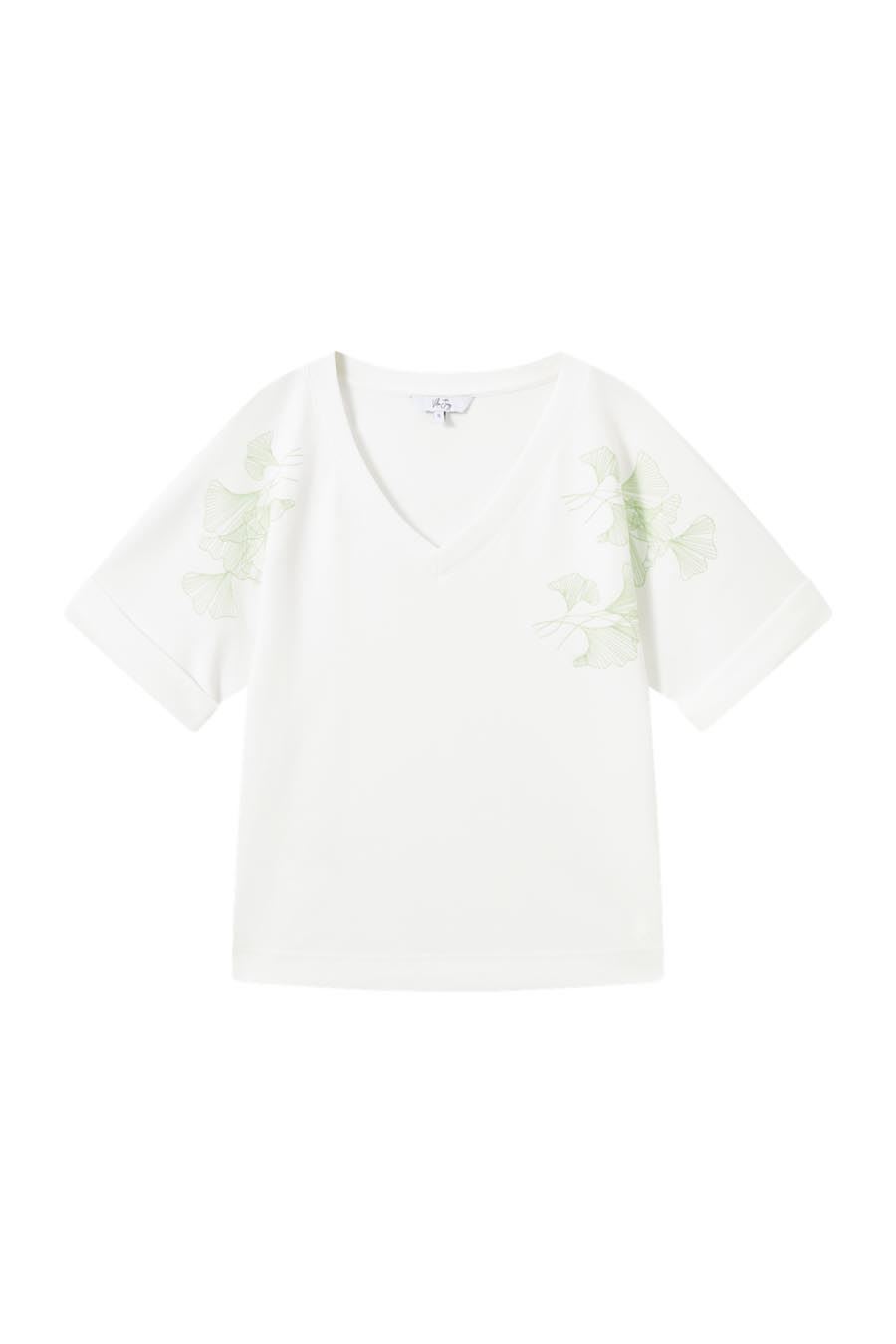 Witte V-hals top met korte mouwen en opgenaaid subtiel groen bladmotief.