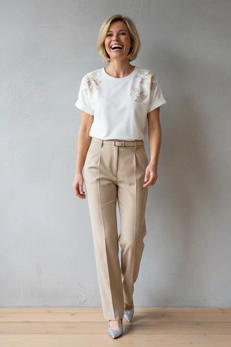 Witte V-hals top met korte mouwen en opgenaaid zandkleurig bladmotief.