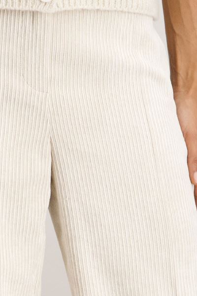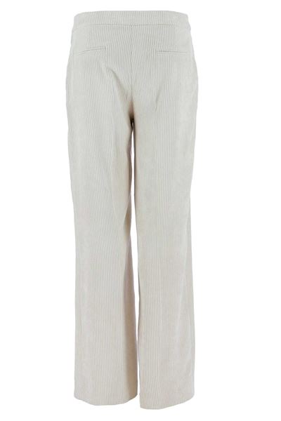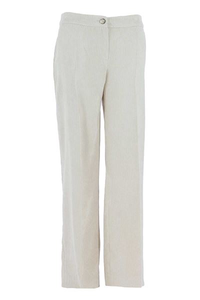 Deze prachtige broek is een verfijnde keuze voor elke modebewuste garderobe. Gemaakt van een lichte, crèmekleurige stof met fijne verticale strepen, straalt hij een subtiele elegantie uit. De broek heeft een klassieke snit met een sterke tailleband, die wordt geaccentueerd door een enkele decoratieve knoop aan de voorzijde. De rechte pijpen geven je look een vleugje tijdloze sophistication, perfect voor zowel zakelijke als casual gelegenheden.