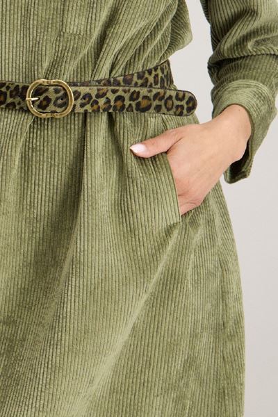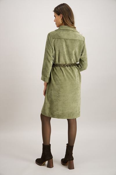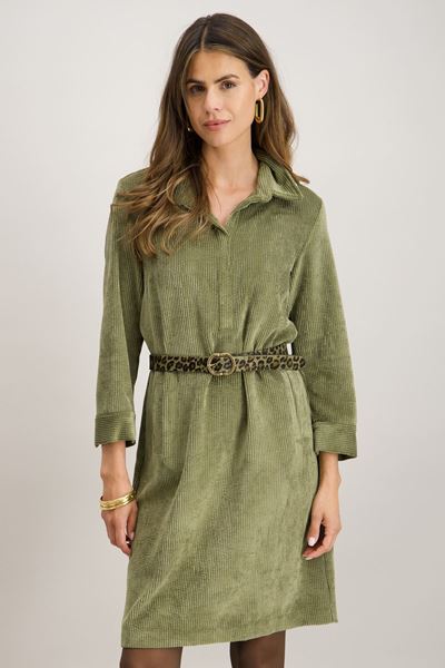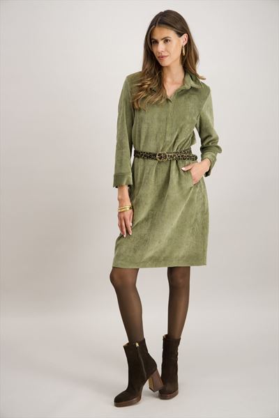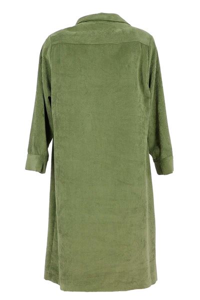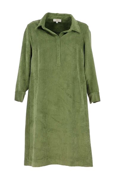 Deze prachtige jurk in een rustgevende olijfgroene kleur is een perfecte aanvulling op je herfstgarderobe. De jurk is gemaakt van een zachte corduroy stof, die niet alleen comfortabel aanvoelt maar ook een vleugje vintage charme toevoegt aan je look. De jurk heeft een klassieke kraag en een subtiele ritssluiting aan de voorkant, waardoor je gemakkelijk een speelse of meer formele uitstraling kunt creëren.
