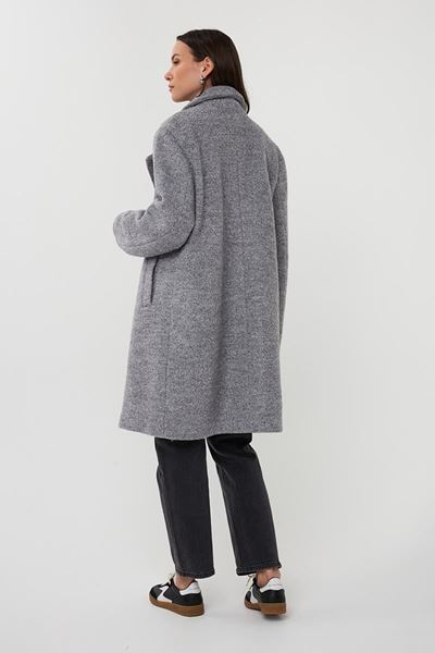 Deze grijze wollen mantel biedt een prachtige structuur en een klassieke uitstraling. Hij is voorzien van een dubbele knoopsluiting en heeft een ruimvallende pasvorm die zowel elegantie als warmte garandeert.