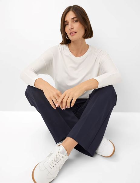 Zelfverzekerd, stijlvol en modern – zo presenteert de palazzobroek in Style MAINE zich. Met een wijde Wide Leg-pasvorm en strakke belijning staat deze broek voor een vrouwelijke, eigentijdse look. De vloeiende vorm krijgt een klassieke uitstraling door de scherpe vouw, normale taillehoogte en Franse steekzakken. In combinatie met de cleane afwerking ontstaat een tijdloze stijl die het hele jaar door gedragen kan worden. Voor comfort zorgt de hoogwaardige jerseykwaliteit. De mix van viscose, polyamide en elastaan biedt een aangename elasticiteit, vormvastheid en een glad, comfortabel draaggevoel.