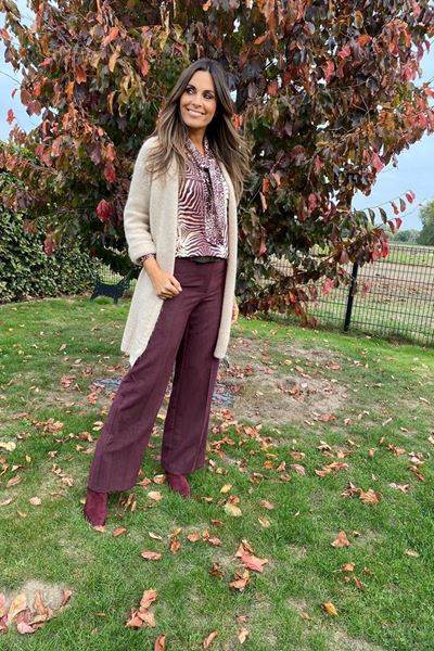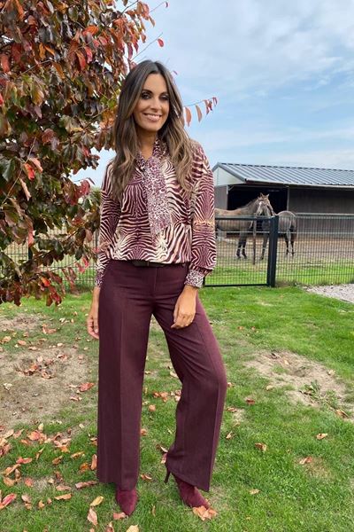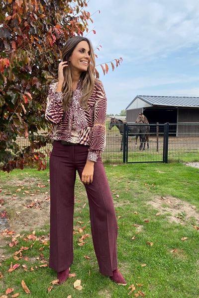Deze elegante blouse is een echte blikvanger, uitgevoerd in een levendig en stijlvol dierenprint patroon. De combinatie van rijke bordeauxrode en crèmige tinten zorgt voor een speelse en toch verfijnde uitstraling. De V-hals voegt een vleugje vrouwelijke charme toe, terwijl de lange mouwen met manchetten zorgen voor een klassieke afwerking. De blouse is perfect om elke outfit een gedurfde en modieuze touch te geven. Ideaal te combineren met zowel een casual jeans als een chic rokje. Mis deze tijdloze en toch eigentijdse stijl niet in je garderobe!