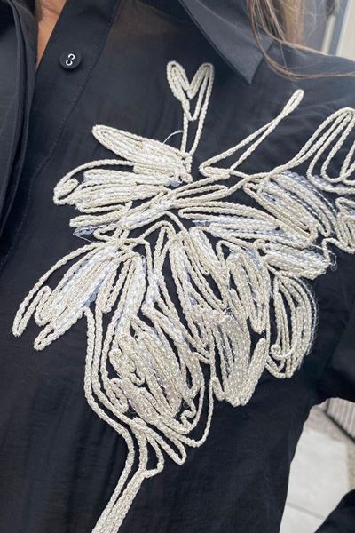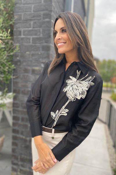 De outfit straalt raffinement en elegantie uit. Het zwarte overhemd maakt meteen indruk met zijn subtiele maar onderscheidende bloemenborduursel, dat een vleugje artistieke flair toevoegt aan de klassieke look. De lange mouwen en nette kraag geven een tijdloos silhouet dat geschikt is voor zowel formele als informele gelegenheden.