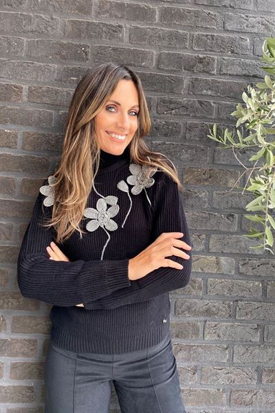 De trui presenteert een sfeervolle combinatie van comfort en stijl. Het is een zwarte, grofgebreide trui met een elegante col die warmte en chic biedt. Wat deze trui echt bijzonder maakt, zijn de prachtige zilveren bloemenapplicaties die subtiele verfijning toevoegen aan het ontwerp. Deze bloemendetails zorgen voor een speelse, maar toch elegante uitstraling.