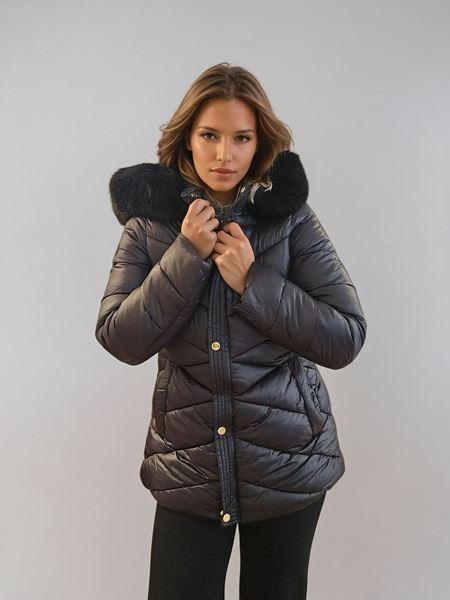 Deze gewatteerde jas straalt pure elegantie uit met zijn dieppaarse tint en luxueuze uitstraling. De jas heeft een prachtige getailleerde snit die het silhouet flatteert en is afgewerkt met chique gouden knopen. Het pluizige, zwarte faux fur accent aan de capuchon voegt een vleugje glamour toe en houdt je knus in de winterse kou. De diagonale stiksels geven het geheel een moderne twist en zorgen voor een verfijnde textuur.