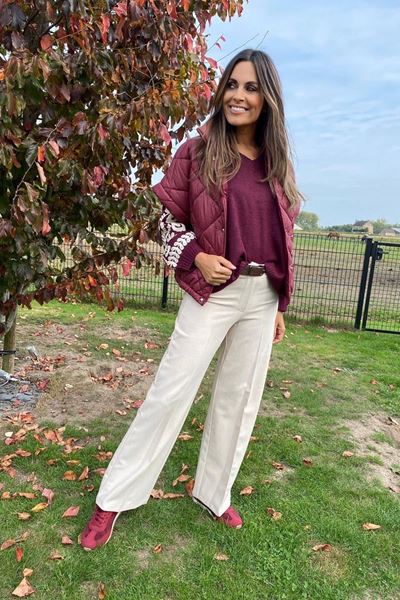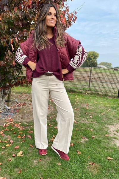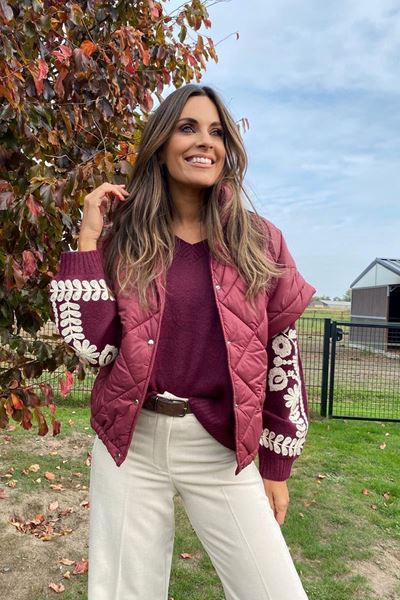 De outfit straalt een prachtige herfststijl uit met een rijke kleurenpalet. De model draagt een dikke, gewatteerde jas in een warme bordeauxrode tint. De jas heeft subtiele knopen aan de voorkant en zorgt voor een knusse uitstraling. Daaronder is een trui met lange mouwen zichtbaar, eveneens in bordeauxrood, die extra flair krijgt door de gedetailleerde witte bloemen- en bladvormen op de mouwen.