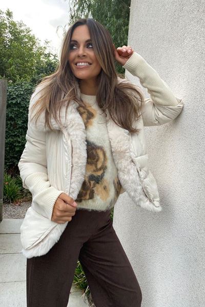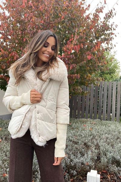 Deze elegante gewatteerde jas straalt luxe uit met zijn zachte ivoorkleur en verfijnde afwerking. De jas is ontworpen om je warm en stijlvol te houden tijdens de koudere maanden. De opvallende nepbont kraag voegt een vleugje glamour toe, terwijl de volumineuze vulling zorgt voor ultiem comfort. De jas heeft een korte snit, waardoor het perfect is om te combineren met diverse outfits. De lange ribgebreide mouwen geven extra warmte en contrast aan het geheel. Perfect voor elke winterse gelegenheid!