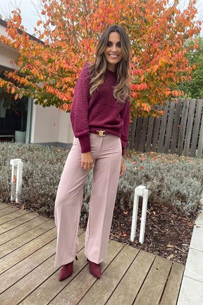 Stralend in een elegante herfstlook, draagt de eerste outfit een wijnrode trui met prachtige kantaccenten op de mouwen. Deze details geven de look een vrouwelijke en verfijnde uitstraling. De trui is stijlvol gecombineerd met een paar lichtroze wijde broek, die vloeiend en comfortabel om de benen valt. Perfect voor een chique maar ontspannen stijl.