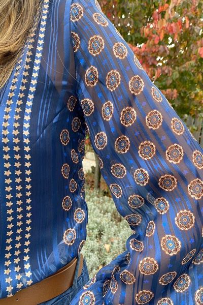 De blouse straalt elegantie uit met zijn rijke blauwe kleur en subtiele gestreepte details. De stof, voorzien van een speels cirkeldessin, geeft een dynamische flair aan het geheel. De knoppen zijn verfijnd afgewerkt en geven een klassieke touch.