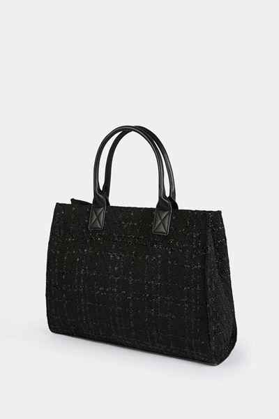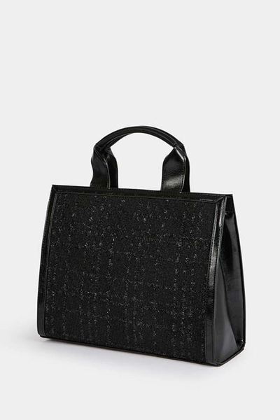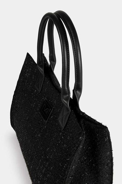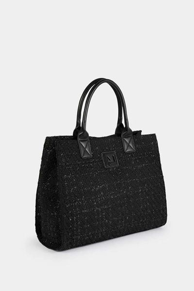 De handtas in de afbeelding straalt een tijdloze elegantie uit. Het ontwerp is uitgevoerd in een diep zwart met een subtiele textuur die het geheel een luxueuze uitstraling geeft. Twee stevige hengsels maken de tas gemakkelijk draagbaar, terwijl het minimalistische logo op de voorkant een verfijnde touch toevoegt. Deze tas is de perfecte combinatie van stijl en functionaliteit, ideaal voor zowel dagelijks gebruik als een avondje uit. Een waar statement piece voor elke garderobe.