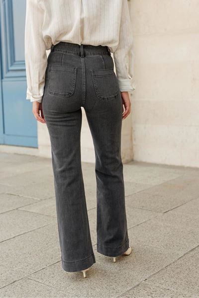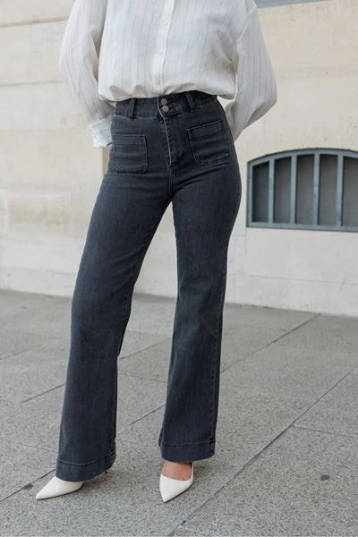 Donkere grijze high-waist jeans van het merk Oraije met wijde pijpen en opgestikte voorzakjes. Perfect voor een casual look!