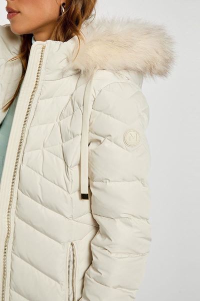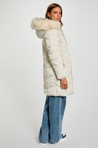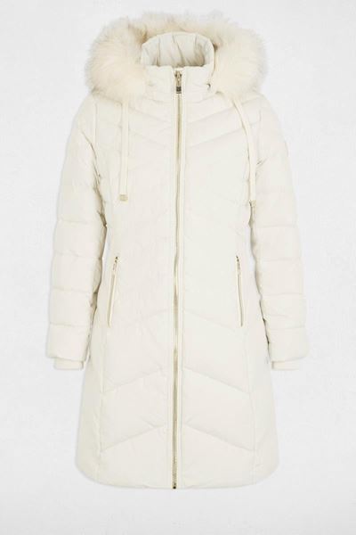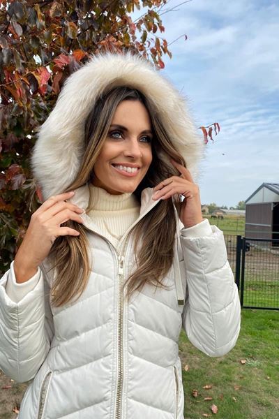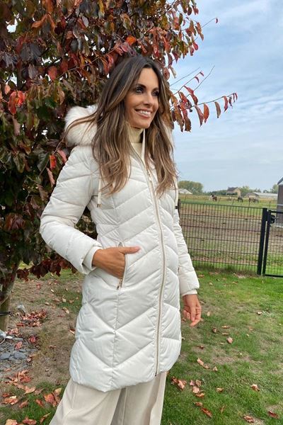 Deze elegante winterjas in een zachte ivoorwitte tint straalt pure verfijning uit. Het quilten van het ontwerp zorgt voor een tijdloze en chique uitstraling die perfect past bij de koude maanden. De jas heeft een luxe merinobontkraag, die niet alleen stijlvol is maar ook extra warmte biedt. De lange lengte van de jas beschermt je tegen gure wind en kou. De gouden ritsen voegen een vleugje glamour toe en zijn zowel functioneel als decoratief, met handige steekzakken aan de voorkant voor extra opbergruimte. Een absolute must-have voor iedere modebewuste garderobe!