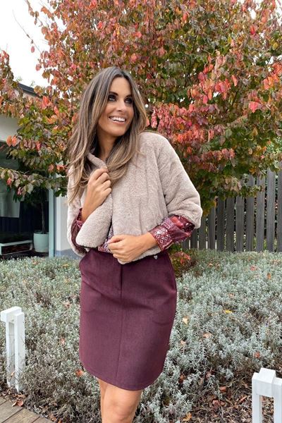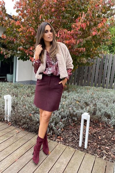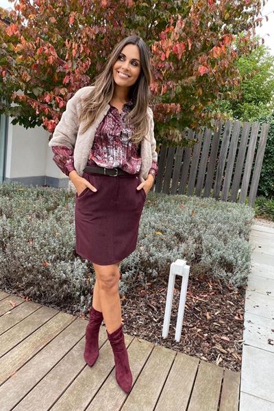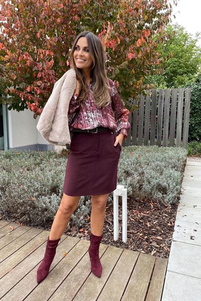 De stijlvolle outfit bestaat uit een prachtige bordeauxrode rok die elegant boven de knie valt. Deze rok is perfect gecombineerd met een kleurrijke blouse met een levendig patroon in tinten van rood en wit. Om de look compleet te maken, wordt er een knusse faux-fur jas nonchalant over de schouder gedragen, ideaal voor de koelere dagen van het jaar.