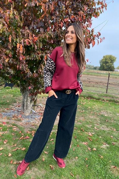 De outfit straalt stijl en comfort uit, perfect voor een casual dagje uit. De donkerrode trui valt meteen op door de combinatie van basic en stijlvol. De luipaardprint mouwen voegen een speelse toets toe aan de look, wat het geheel een gedurfde uitstraling geeft.
