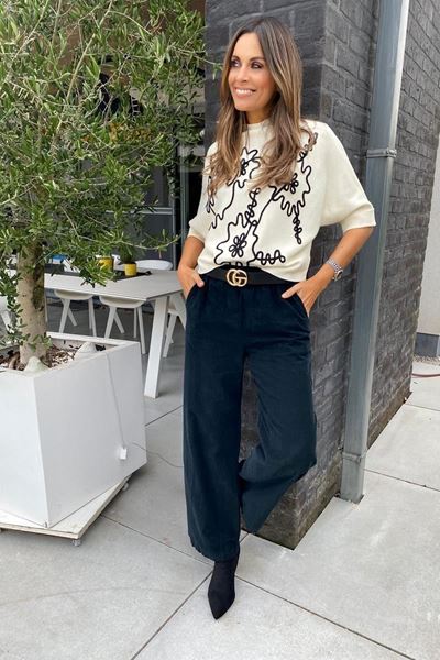 De trui is gecombineerd met een paar wijdvallende zwarte broek. Deze broek biedt niet alleen comfort maar ook een vleugje elegantie dankzij de losse pasvorm. De look wordt verder opgefleurd met een zwarte riem met een opvallende gouden gesp die subtiele luxe toevoegt.