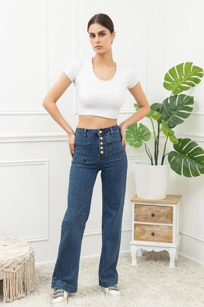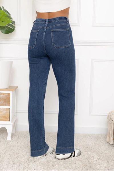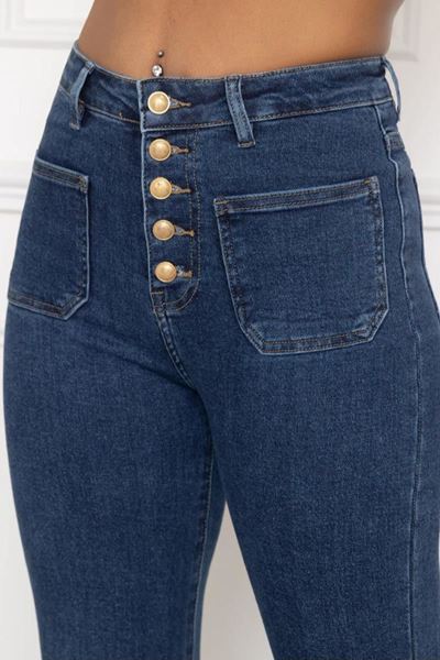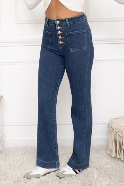 Stap stijlvol en comfortabel de dag in met deze hoog getailleerde jeans. Het design heeft een flatterende pasvorm die de taille mooi accentueert. De gouden knopen aan de voorkant geven een chique touch en zorgen ervoor dat de broek een echte eyecatcher is. De diepblauwe denim stof biedt een tijdloze look die gemakkelijk te combineren is met allerlei tops en schoenen.