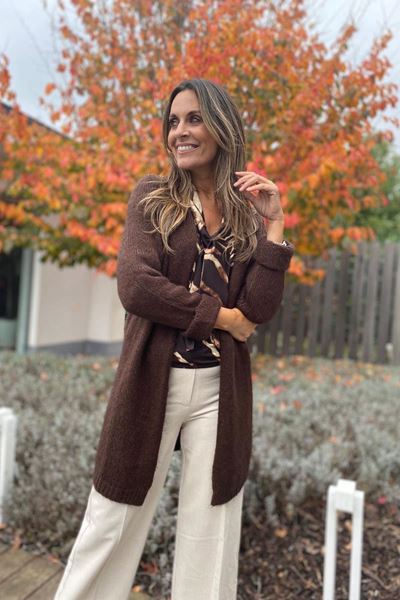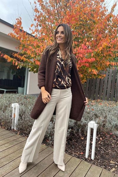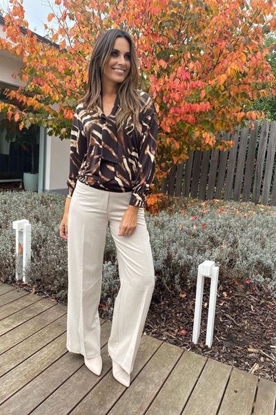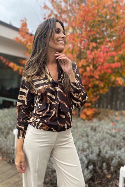 Deze top heeft een stoer, abstract patroon in bruin en zwart. Super leuk met de sjaalkraag details voor een speelse touch.
