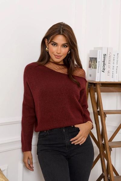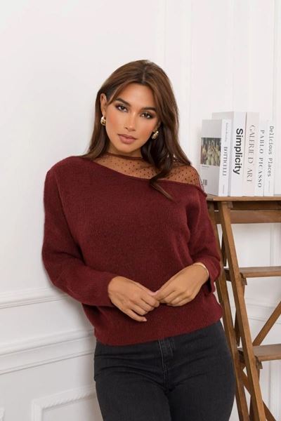 Maak een fashionstatement met deze sweater in een warme bordeauxrode tint. Het stuk is voorzien van een transparante bovenkant met verfijnde stippenpatroon, wat een speelse yet elegante uitstraling geeft. Het materiaal ziet er zacht en comfortabel uit, perfect voor het toevoegen van een vleugje moeiteloze chic aan je garderobe.