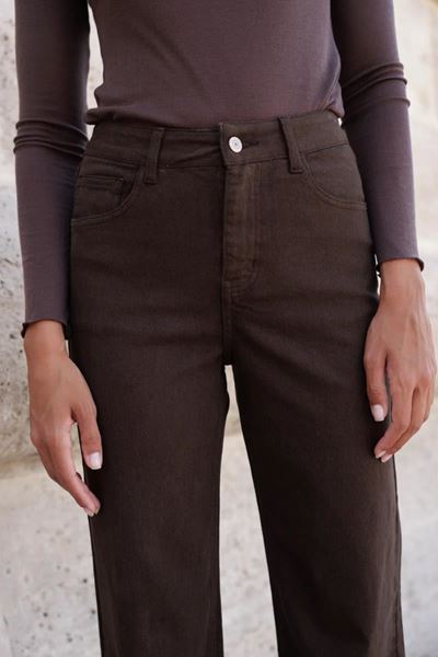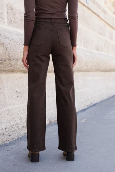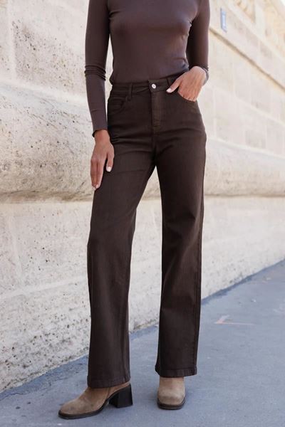 Donker bruine broek met hoge taille . Deze broek heeft een flatterende snit en een zachte, vrouwelijke uitstraling, perfect voor een avondje uit of een casual dagje in de stad.