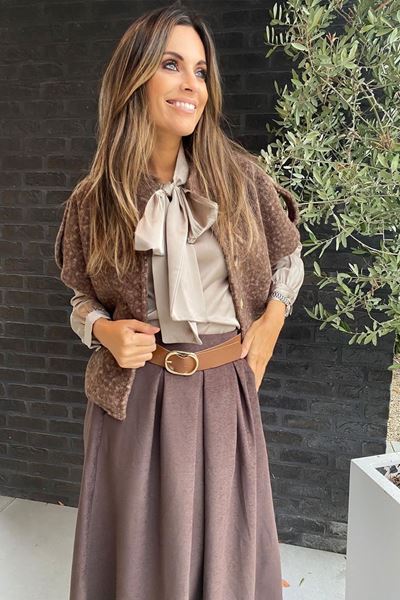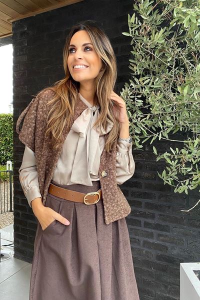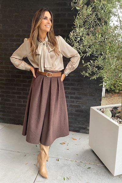 De rok is in een diep chocoladebruin en valt tot net onder de knie, wat zorgt voor een tijdloze en verfijnde look. De rok is voorzien van elegante plooien die het silhouet benadrukken. De combinatie met de brede bruine riem met een goudkleurige gesp accentueert de taille perfect en voegt een vleugje glamour toe.