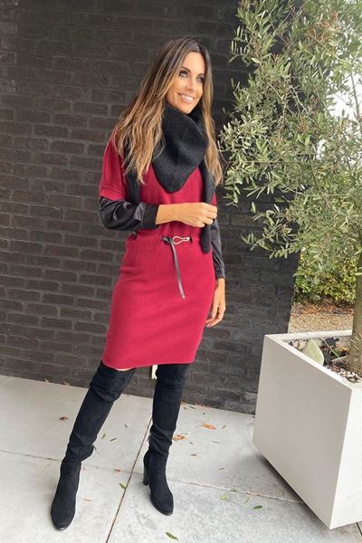 Deze stijlvolle outfit bestaat uit eenbordeaux rode jurk die elegant tot op de knie valt. De jurk is prachtig gecombineerd met een zwarte blouse met lange mouwen die subtiel onder de mouwen van de jurk uitkomt, wat een mooi contrast creëert.
