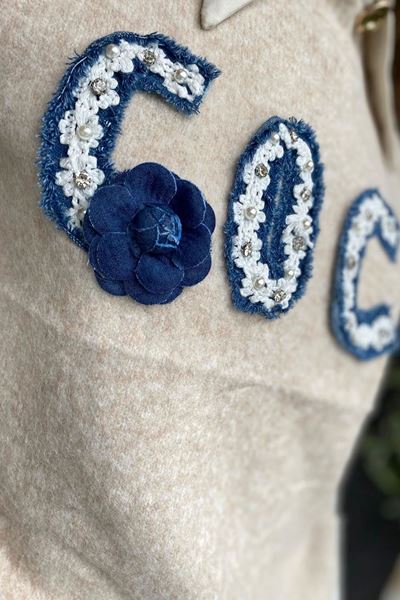 Ontdek een verfrissende look met deze stijlvolle outfit! De trui is een heerlijke mix van comfort en mode, met een charmante beige kleur die warmte uitstraalt. Het woord "COCO" is speels geaccentueerd met blauwe letters, waardoor een levendige touch wordt toegevoegd. De trui is afgewerkt met een col van een lichtere stof, die een klassieke uitstraling behoudt en perfect aansluit bij de rest van de look.