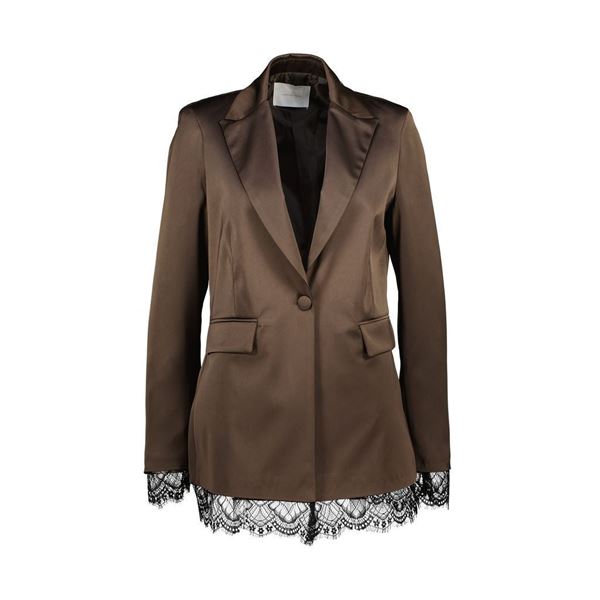 Ontdek de verfijning van deze prachtige bruine blazer. Met een glanzende afwerking straalt deze blazer elegantie uit bij elke gelegenheid. Het unieke en gedetailleerde kant aan de zoom voegt een vleugje sensuele charme toe, wat deze blazer perfect maakt voor zowel formele als casual settings. De klassieke enkele knoopsluiting en de subtiele klepzakken zorgen voor een tijdloze uitstraling. Of je hem nu draagt met een stijlvolle broek of over een jurk, deze blazer is een veelzijdige toevoeging aan elke garderobe.